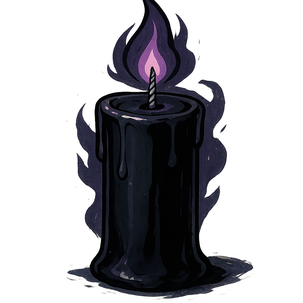 This unsettling black candle stands about six inches tall, its wax darker than midnight and smooth as polished obsidian. When lit, it burns with a dim purple flame that casts eerie, dancing shadows but produces no smoke whatsoever. The flame seems to draw light toward it rather than emit it, creating an almost hypnotic effect.