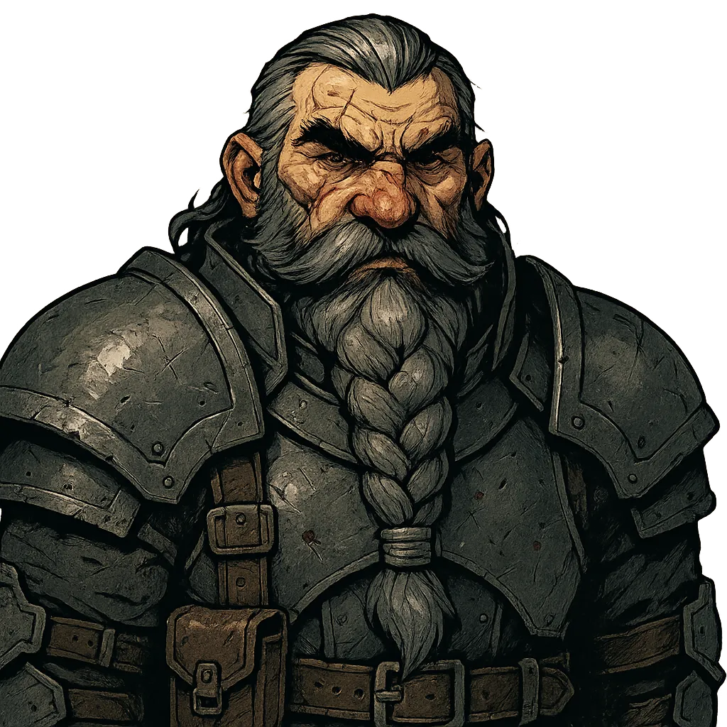 Baern Ironfist is the Captain of the City Watch, a grizzled dwarven veteran who has spent decades keeping the streets of Lusteris safe. Broad-shouldered and built like a fortress, his scarred face and iron-gray beard give him the look of a man who has seen it all—and lived to tell the tale. His watch uniform, though well-kept, is worn from years of service, battle, and late nights spent enforcing the law. His piercing dark eyes scan crowds with the instinct of a lifelong officer, always searching for trouble before it starts.