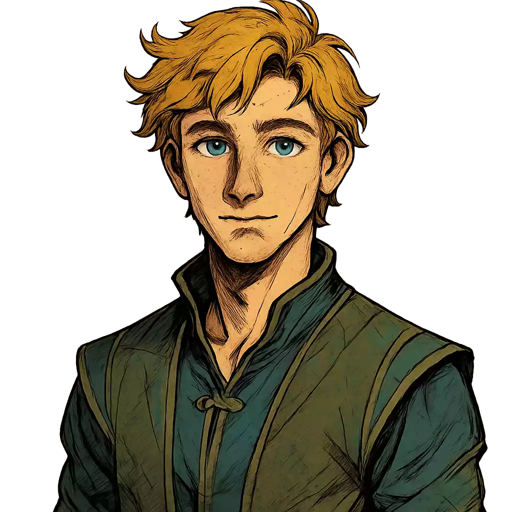 Brenlan Kael is a young man of 17 years, possessing an unassuming charm. He is Lord Elrin Kael’s son and heir to the Lordship of Southaven. With tousled blonde hair that catches the light in vibrant shades of gold, his gentle blue eyes radiate curiosity and warmth. He has a lean build, typical of someone who spends more time in libraries and courts than in training grounds. His attire, often neat but slightly disheveled, consists of well-tailored tunics in shades of blue and green, reminiscent of his noble lineage.
