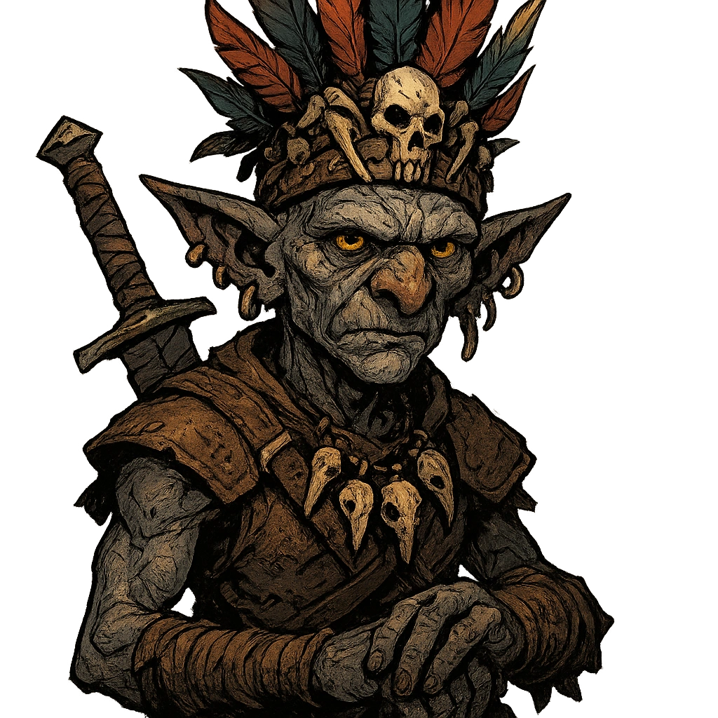 Chief Gralduk was a grizzled goblin chieftain with grey-streaked skin and battle scars that marked him as a veteran of countless tribal conflicts. He wore a headdress of bones and feathers that marked his station, and carried a notched blade that had served him for decades. His eyes, though small and yellow like most goblins, held a shrewd intelligence that belied the stereotype of goblin savagery. Despite his fierce appearance, he moved with the careful deliberation of an aging warrior who had learned that survival required more than strength.