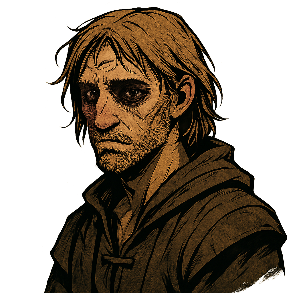 A human man in his early thirties with tired eyes and a perpetually tense jaw, Garrin works at the Scarlet Shield Tavern. He wears simple clothes and rarely makes eye contact. Though friendly enough, there’s a shadow behind every smile and a weight to his silence when talk turns to the past.