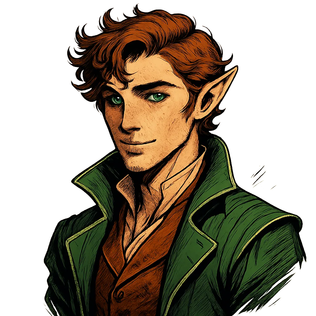 The half-elf bears the youthful look of someone barely nineteen, though there’s a quiet depth in his eyes that hints at more years than his appearance suggests. Tousled auburn curls frame a face both handsome and expressive—high cheekbones, a sharp jaw, and a light dusting of freckles giving him a roguish charm softened by elven grace. His bright green eyes gleam with warmth and mischief, while his subtly pointed ears reveal his heritage.