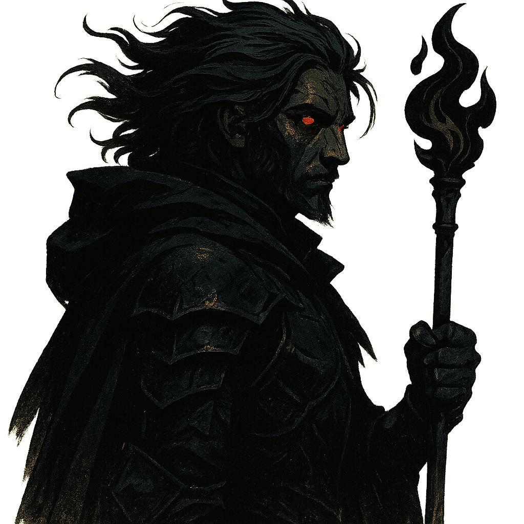 Clad in blackened armor and draped in a cloak that seems to drink in the light, Malrith Kelbirn is a figure who inspires awe and dread in equal measure. His long, dark hair whips about like a storm, and his eyes glow faintly red, as if lit from within by a star’s dying ember. In one hand he carries a staff crowned with a curling black flame, a symbol of the Order of the Black Star’s devotion to The Unmaker.