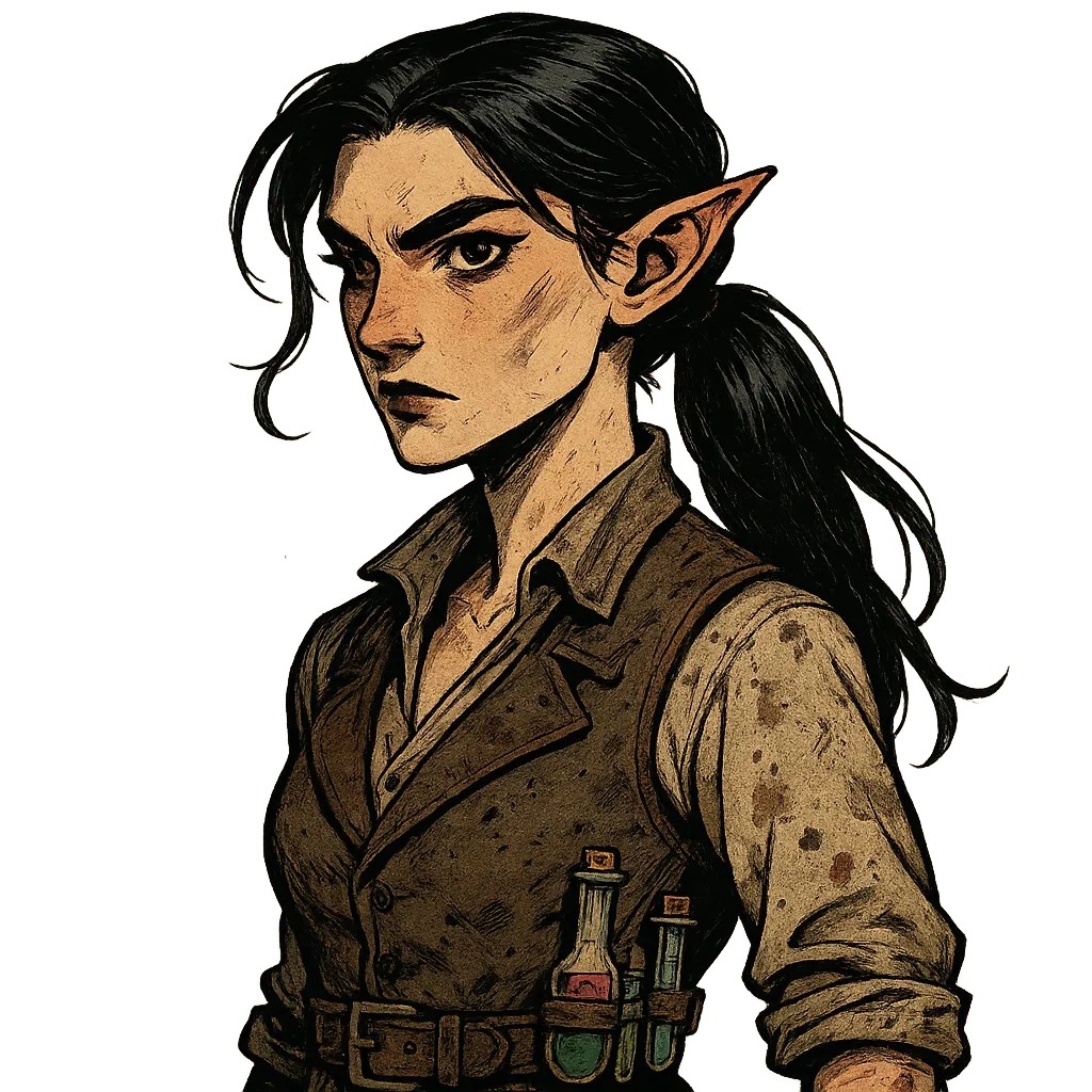 She carries an assortment of vials strapped to her belt, filled with volatile concoctions. A faint smell of sulfur and herbs lingers wherever she goes. On her left wrist, she bears a faint scar - an alchemical mishap from her early experiments.