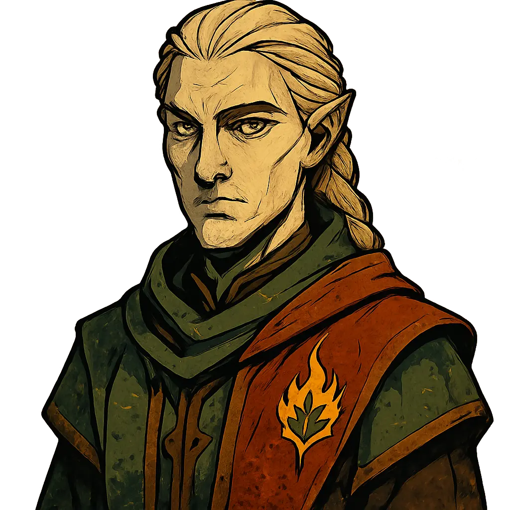 Serelion Thorneweave carries the aura of a high-ranking druid—commanding, still, and steeped in quiet authority. His pale gold hair is worn in a tight, traditional braid of the Eldergrove, and his robes of sun-dappled green and fire-touched red bear the mark of the Verdant Flame. His voice is calm and unhurried, like wind through ancient branches, and his gaze never seems to blink when held too long.