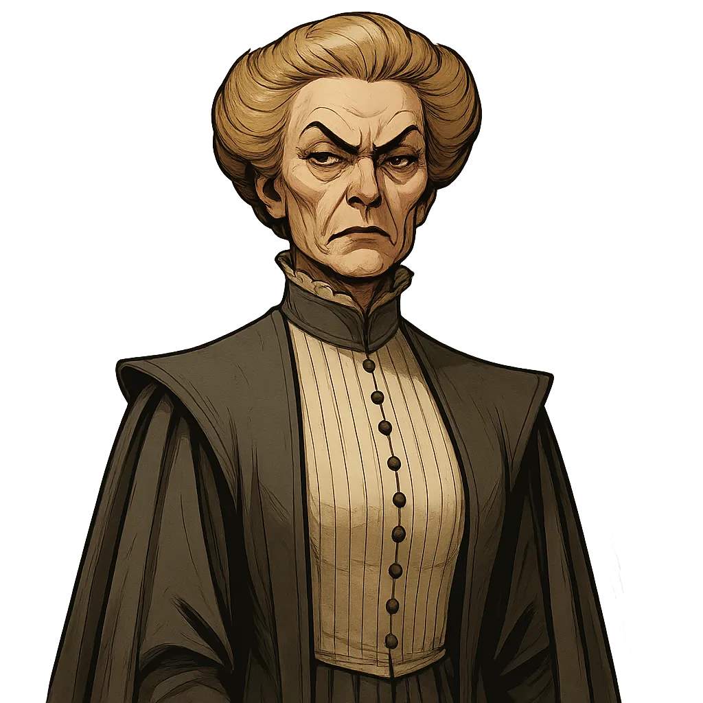 Winnifred Redwyne is the Head Librarian of the Marble Academy, a staunch Traditionalist with a perpetual scowl and a rigid demeanor. A human woman of middling age with straw-blonde hair pulled into a severe bun, she has a harsh, pinched face and deep-set, judgmental eyes that seem to look down on everyone, even those taller than her. She dresses in conservative, outdated academic robes, always pristine, as if to overcompensate for her lack of noble birth or formal magical education.