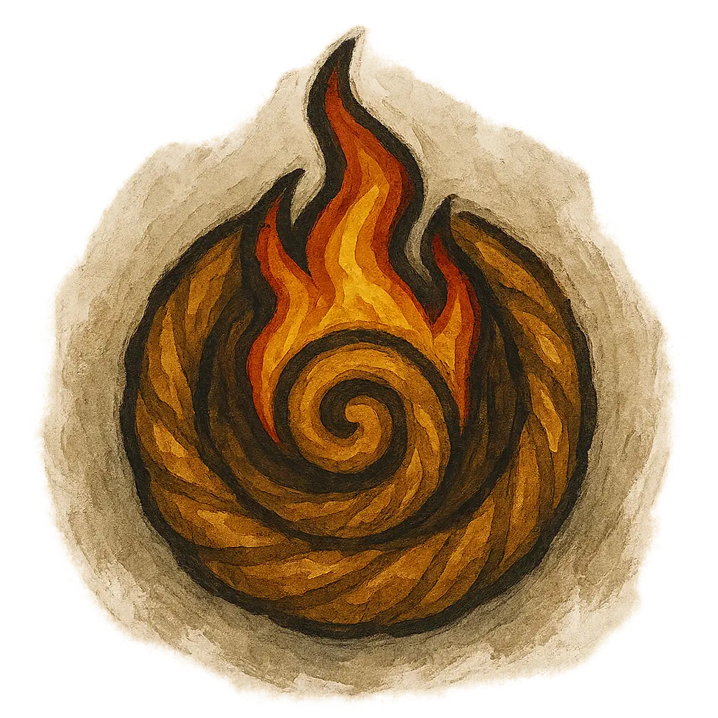 A flame enclosed in a spiral pastry shell, often stitched into aprons, engraved on rolling pins, or hidden beneath pie tins. It’s said the spiral represents both rising heat and the layered mysteries of culinary magic.