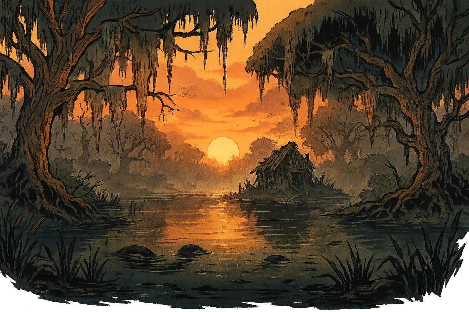 At the heart of the marsh lies a place of true horror: the ruined hut of the Margatha Blacktide, an ancient Green Hag, defeated by heroes of Southaven. Hidden by potent illusions, it was the site of wicked bargains and gruesome rituals, where stolen children were held captive and foul magics brewed. Though the hag was slain, her influence lingers, and the swamp remains a treacherous place, where shadows move unnaturally and the water whispers secrets to those who dare to listen.