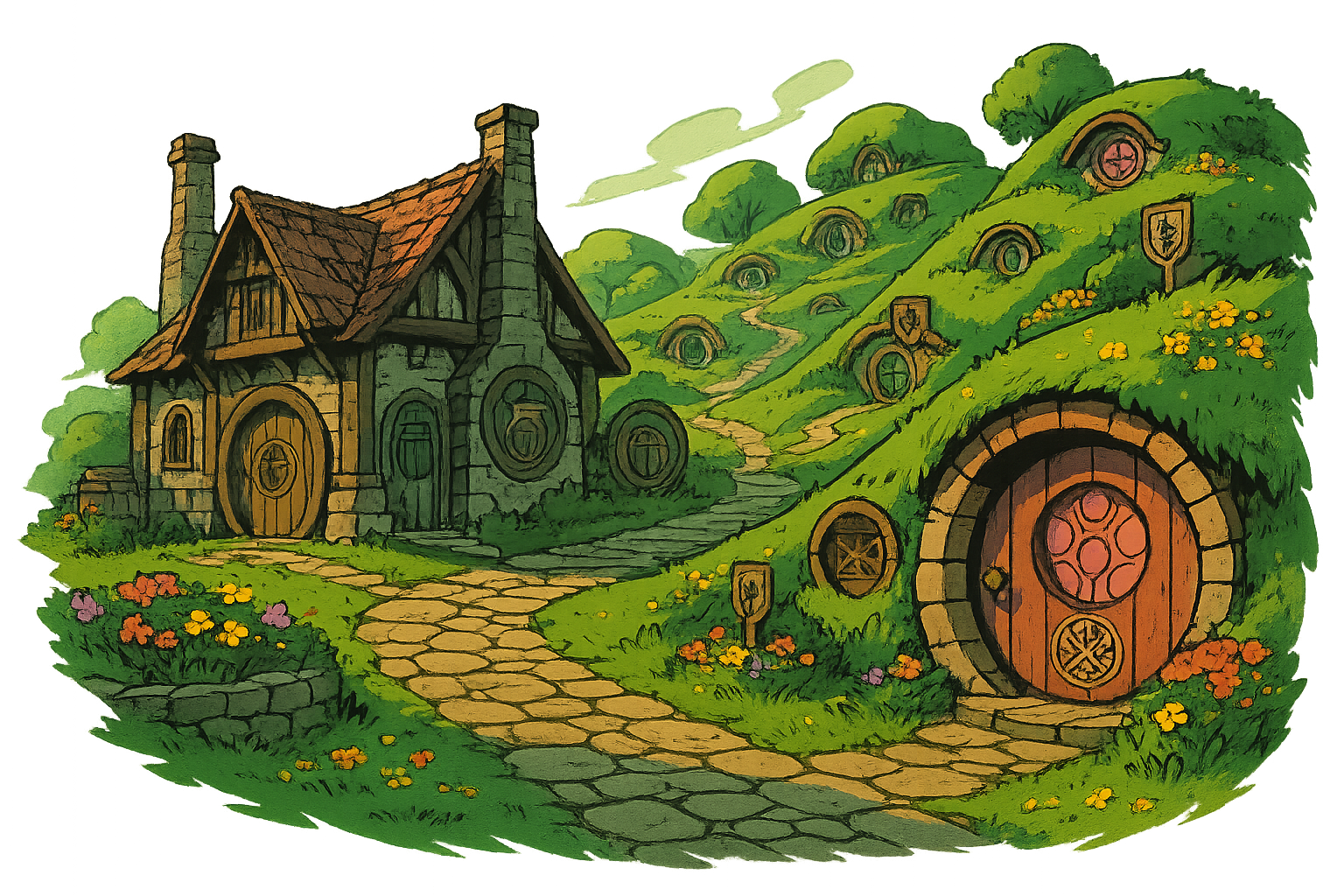 Nestled among rolling green hills and patchwork fields, Brandyburrow is a cheerful halfling village renowned across the land for its brandy, ale, and pickles. Low, round-doored homes with thatched roofs and ivy-covered chimneys dot the hillsides, their gardens bursting with herbs, gourds, and rows of cucumbers destined for the village’s famous barrels. The air always carries a comforting blend of malt, oak, and brine, thanks to the ever-busy brewhouses and pickle sheds scattered throughout the community.