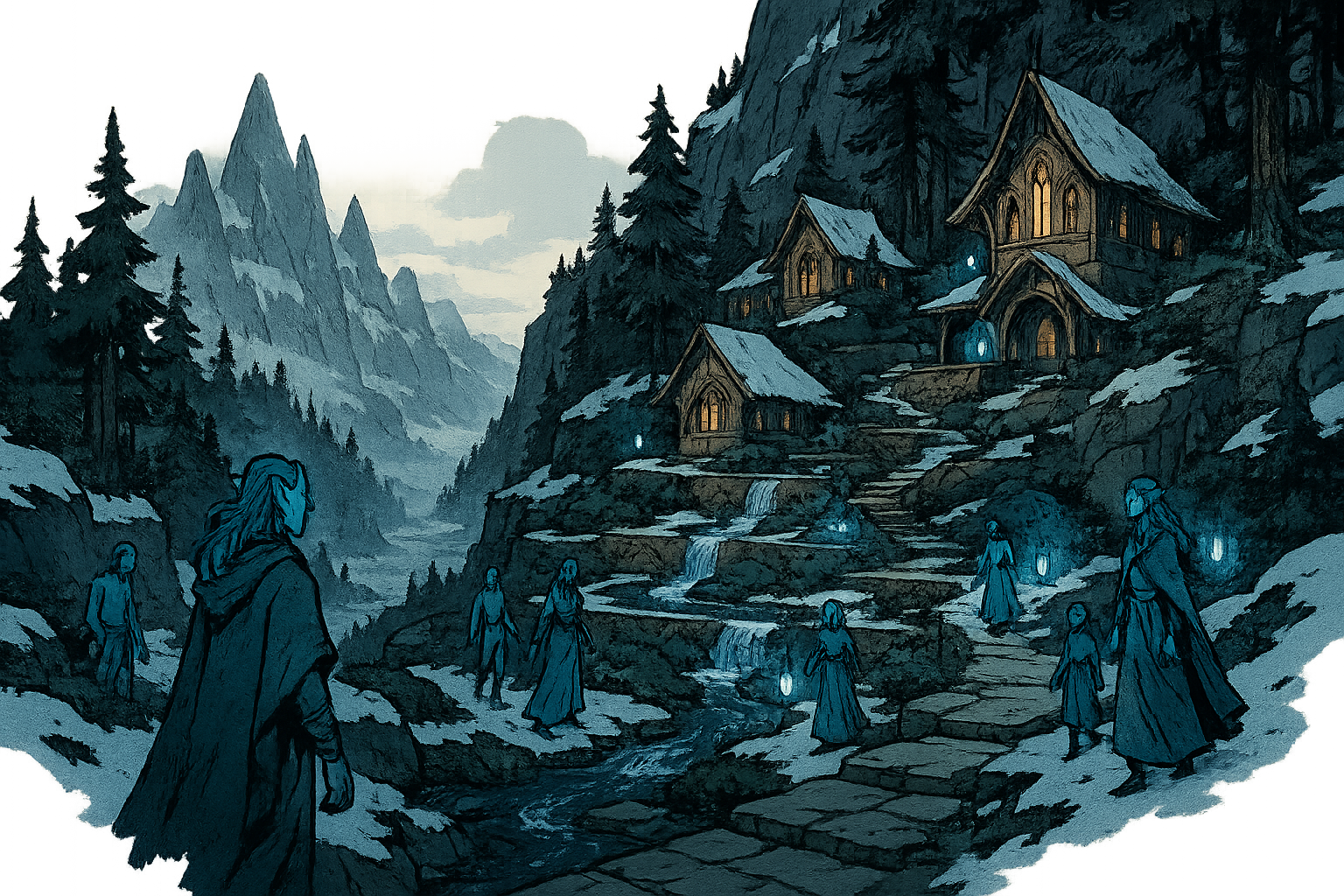 Fadrín itself blends seamlessly into its surroundings. Houses of pale wood and mountain stone cling to terraces cut into the slope, with crystal streams winding through their gardens. Lanterns of silvered glass glow softly at night, casting light like starlight upon the cobbled paths. From the higher terraces, the valleys stretch endlessly below, while the jagged peaks of the Dragonspires loom above, veiled in mist.