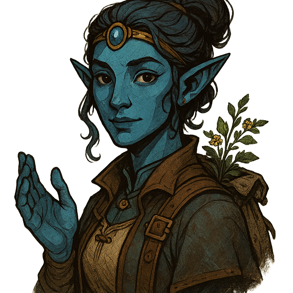 Owner: Miranel Crystalbrook, a serene healer with sapphire skin and gentle hands, known for her knowledge of mountain flora and her generosity toward those in need.