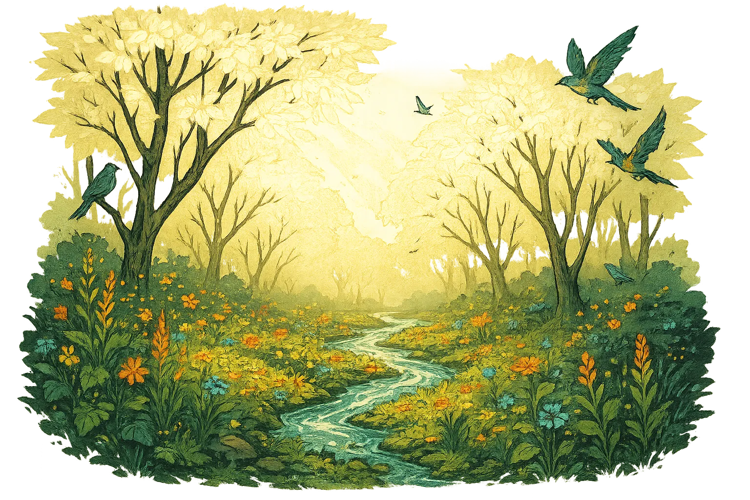 Bathed eternally in golden light, Myrlen’Thal feels like the world’s first breath after dawn. Its trees shimmer with pale leaves that glow softly, even in shadow, and birdsong echoes with unnatural harmony. It is a place of radiant life and joyful renewal, where new growth springs from every fallen leaf. Pilgrims come seeking hope and beginnings, and the druids here speak often of cycles of birth, blossoming, and the sacred promise of the sun’s return.