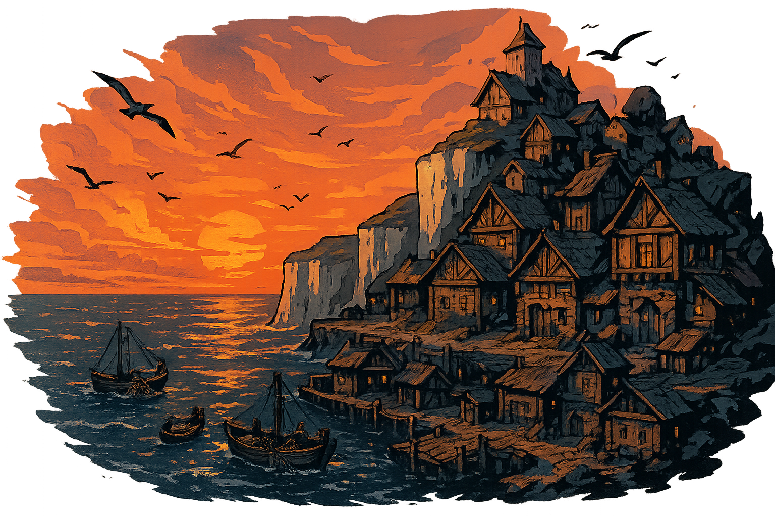 Sunset Bluff is a small human settlement perched on the windswept cliffs overlooking the sea, about 80 miles west of Seawatch and 50 miles southwest of Cobblefoot. The village consists of sturdy timber and stone buildings clustered around a natural harbor, where fishing boats bob in the tide and gulls cry overhead. True to its name, the settlement is famous for its breathtaking sunsets, when the sky blazes orange and pink over the endless horizon, casting the white cliffs in golden light. The air tastes of salt and sea spray, and the constant sound of waves crashing against the rocks below creates a rhythmic backdrop to daily life.