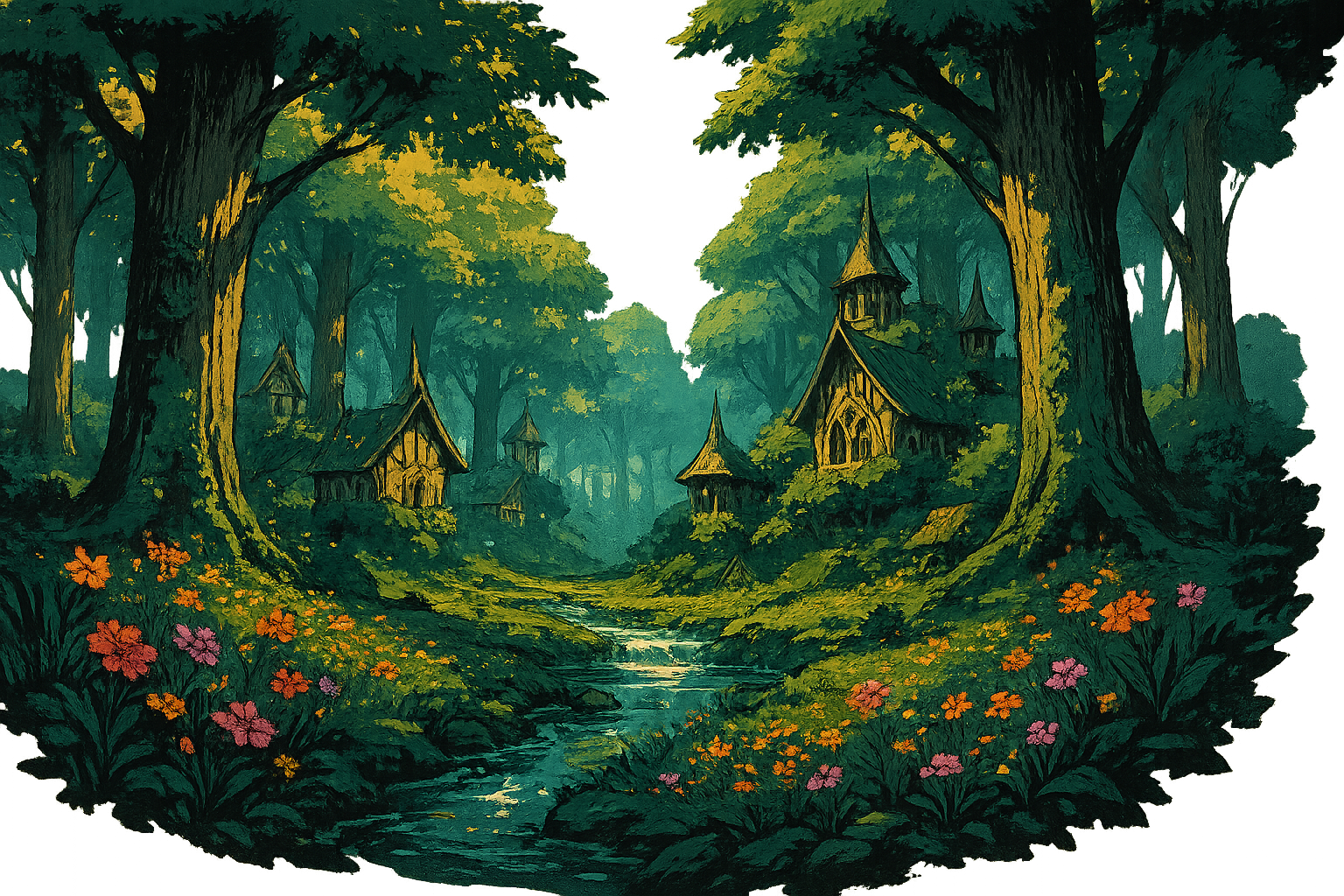 At the heart of Vel Enweir lies Balandel, the capital—a city woven seamlessly into the silverwoods, its halls suspended among branches and waterfalls. Around it, elven villages rest in groves of flowering trees, connected by airy bridges, lantern-lit paths, and songs carried on the wind. Peace here is not fragile but enduring, guarded by druids, spell-singers, and wardens who walk unseen beneath the leaves.